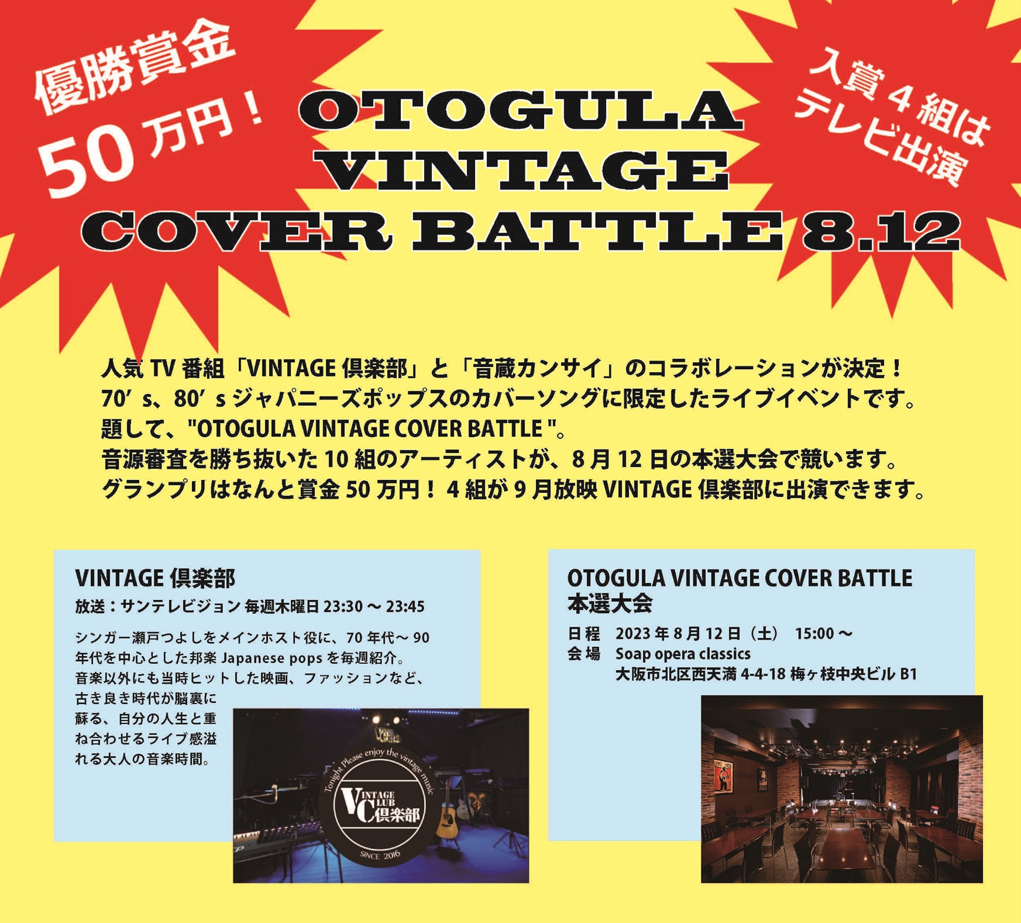 サンテレビの人気番組「VINTAGE倶楽部」と「音蔵カンサイ」のコラボレーション企画、 "OTOGULA VINTAGE COVER BATTLE" の決勝大会出場者が決定しました! 予想を超える多くのアーティストからエントリーをいただきました。 エントリーいただいたアーティストの皆さま、ありがとうございました! 厳正なる音源審査の結果、以下のアーティストが8月12日の決勝大会出場権を勝ち取りました。 おめでとうございます!! 【出演者 ※50音順】 伊谷亜子 キャラメルパッキングTAROO kumi×Yuhki crescentの花 Jay Crystall シュガーズ 瀧本りおな Nuts mellows 西村龍 ねっちぼっち バベルの黒猫 ヒビナオヒロ ※10組の出場枠でしたが、激戦のなか3組が同点10位でしたので、特別に12組の出場となりました。 【決勝大会概要】 日時:2023年 8月12日(土)15:00~18:30 会場:Soap opera classics -Umeda- チケット代:2400円(1ドリンク別途) 【チケット販売について】 7月14日 12:00~販売を開始いたします。 以下のURLよりご購入下さい。 https://tiget.net/events/259089